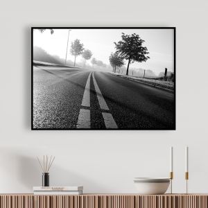 Det minimalistiske sort-hvide udtryk fremhæver vejen som en tydelig linje i billedet, mens de omkringliggende marker og det diffuse lys fra tågen skaber en tidløs kvalitet.